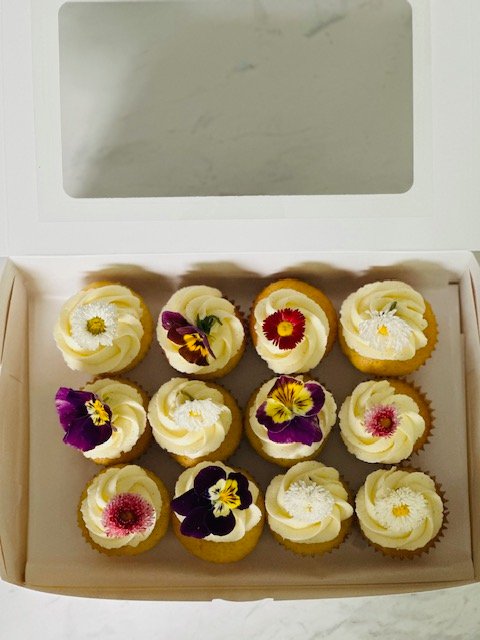 Edible flowers can be added to each cup cake for an additional $5 per box