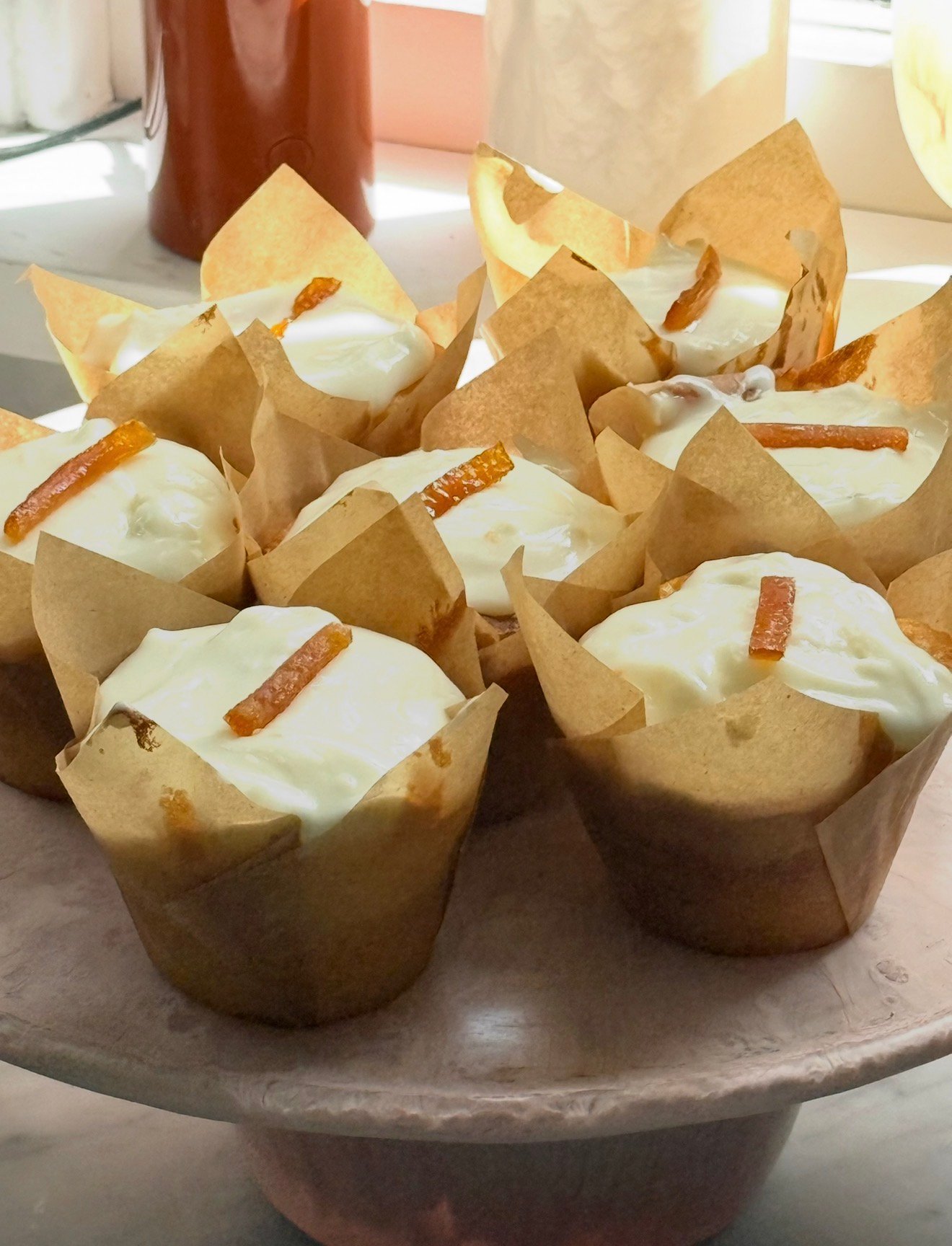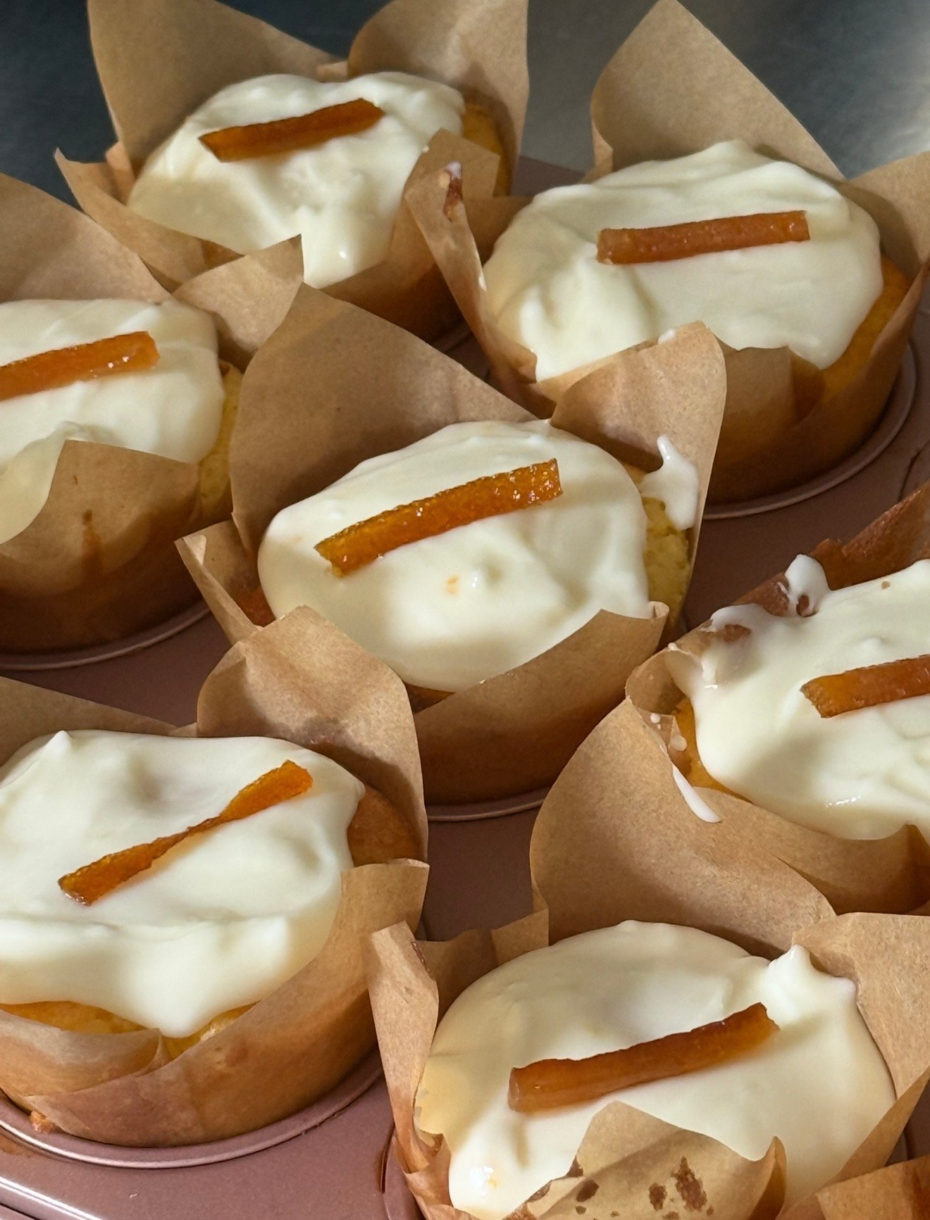 Light and fluffy… beautifully delicate Italian cupcakes finished with orange icing and Calabrian Peel.