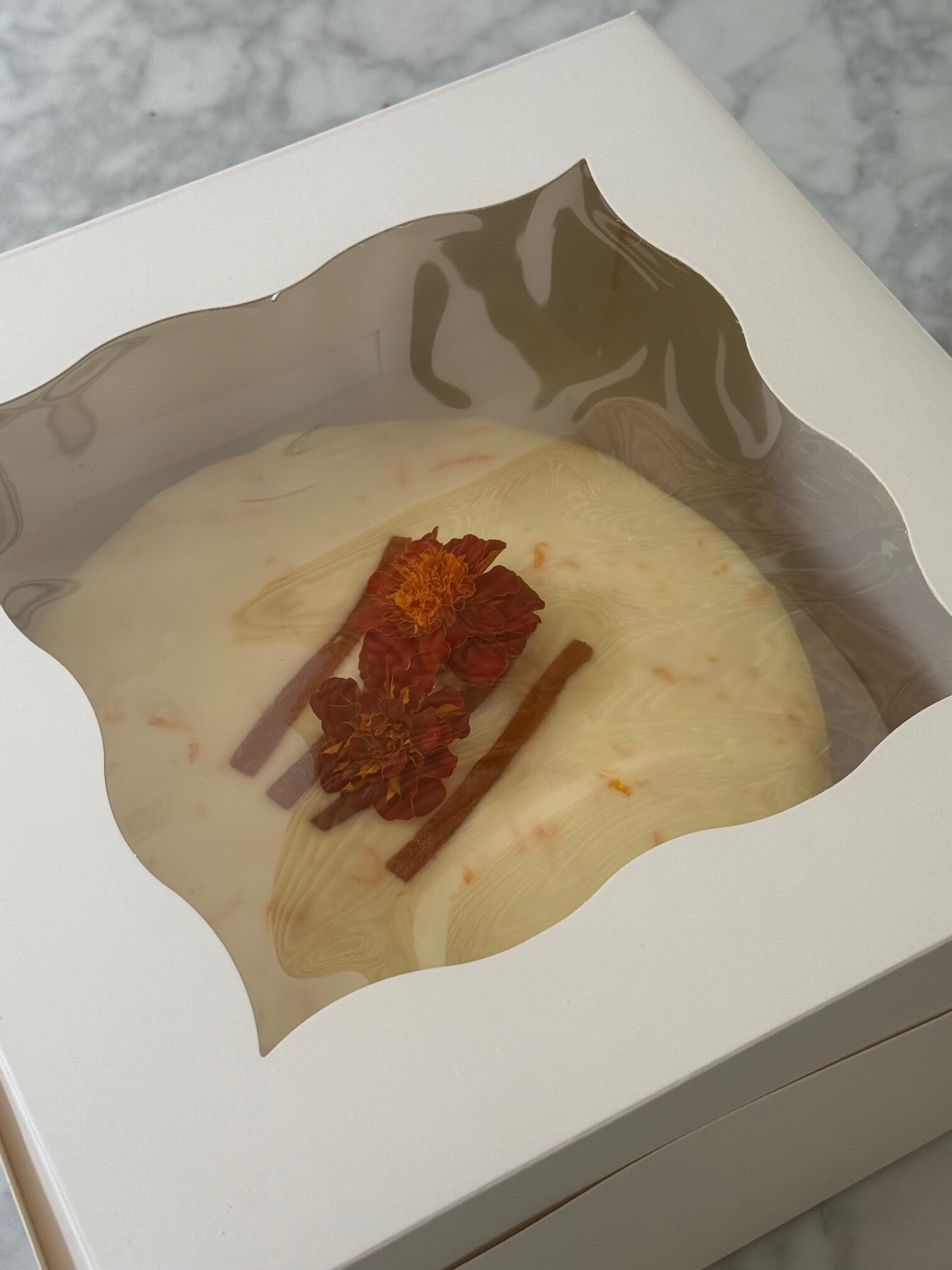 All of our luxurious Cakes and Desserts are beautifully presented in the Messy Cook box and ribbonSEASONAL OFFERING - Individual Pavlovas topped with poached rhubarb infused with Vanilla... Chantilly cream & Fresh Raspberries $85 box 9
