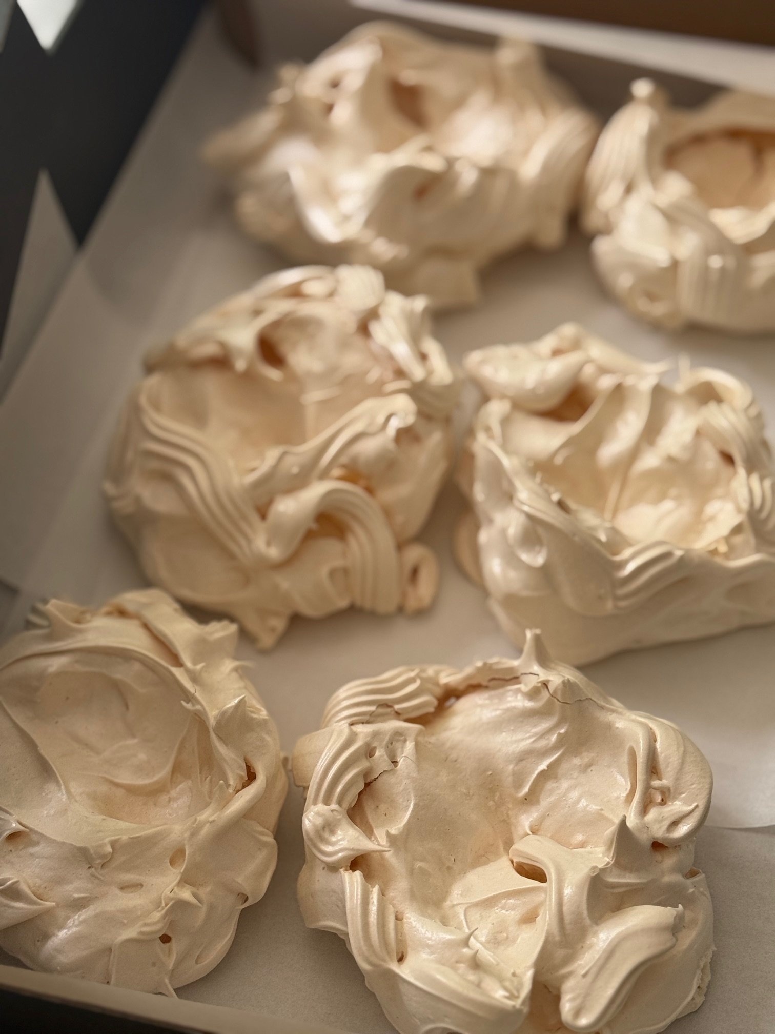 Pavlova Kits – freshly baked and cooled in the oven for crispness .. comes boxed with 2 bowls : either raspberries or strawberries and a divine vanilla bean chantilly cream .