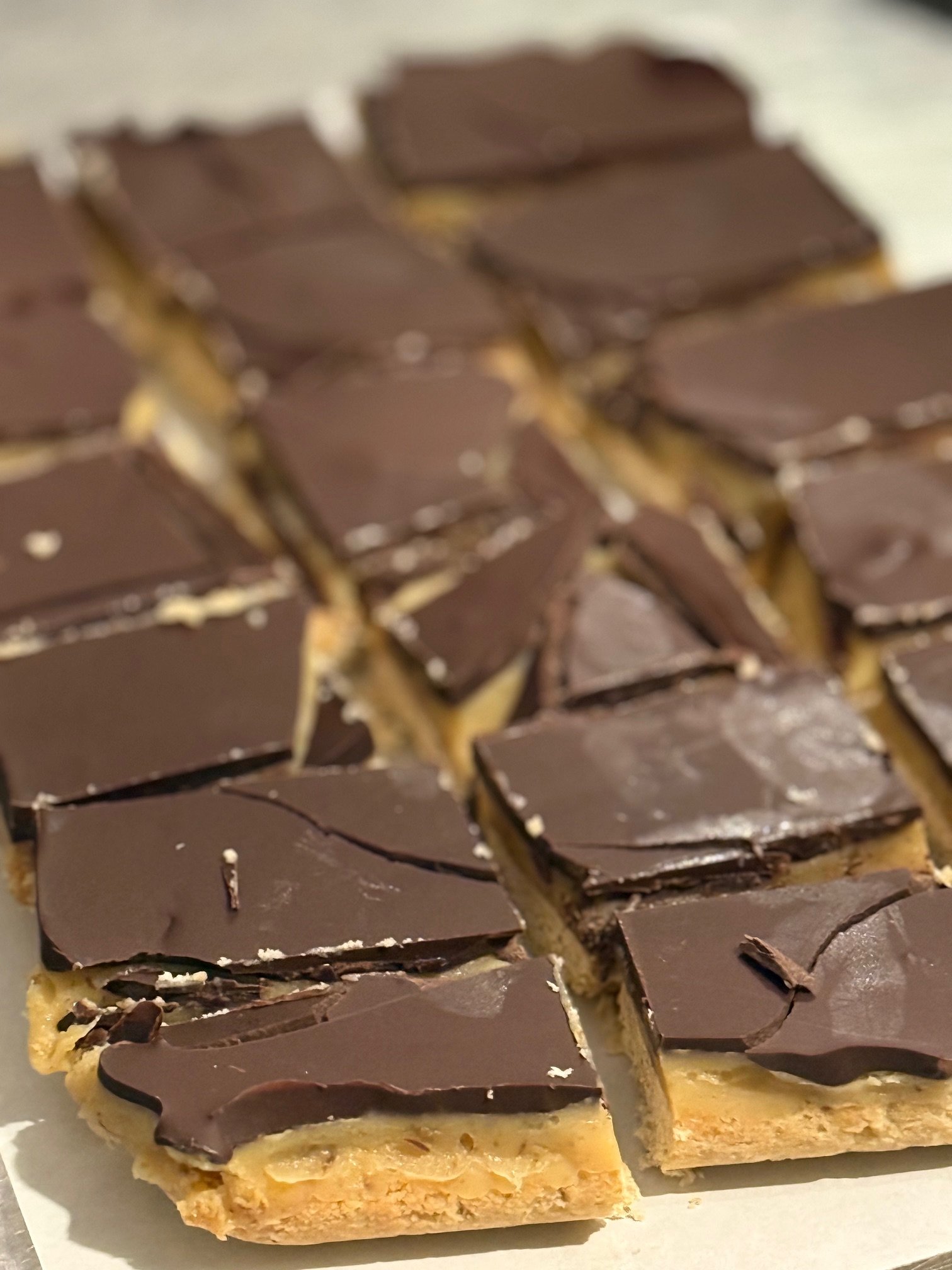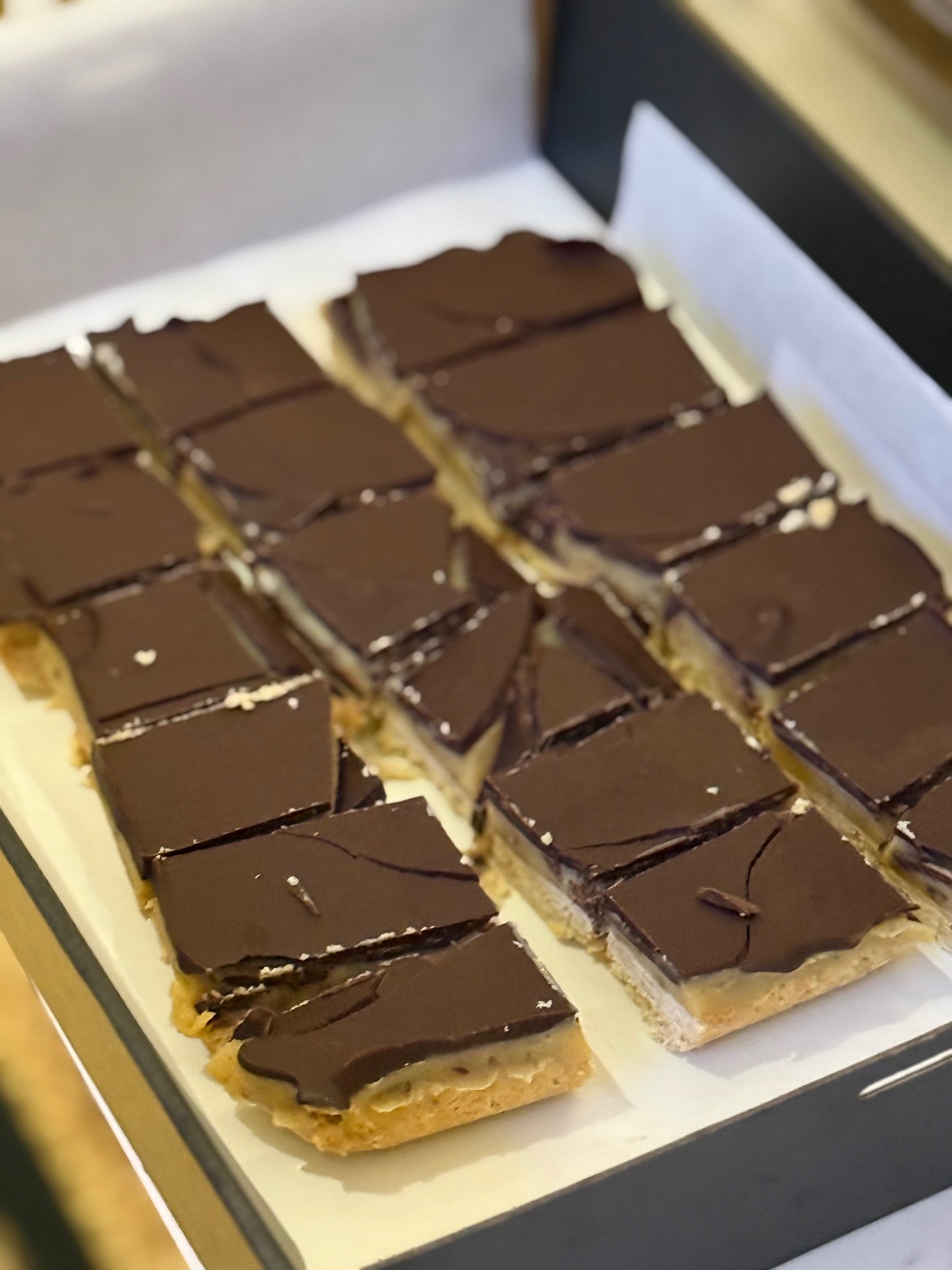 3 layers of luxury – the base having a coconut crumb topped with caramel and then 80 percent cocoa chocolate