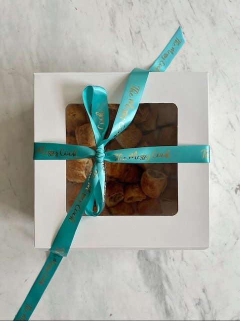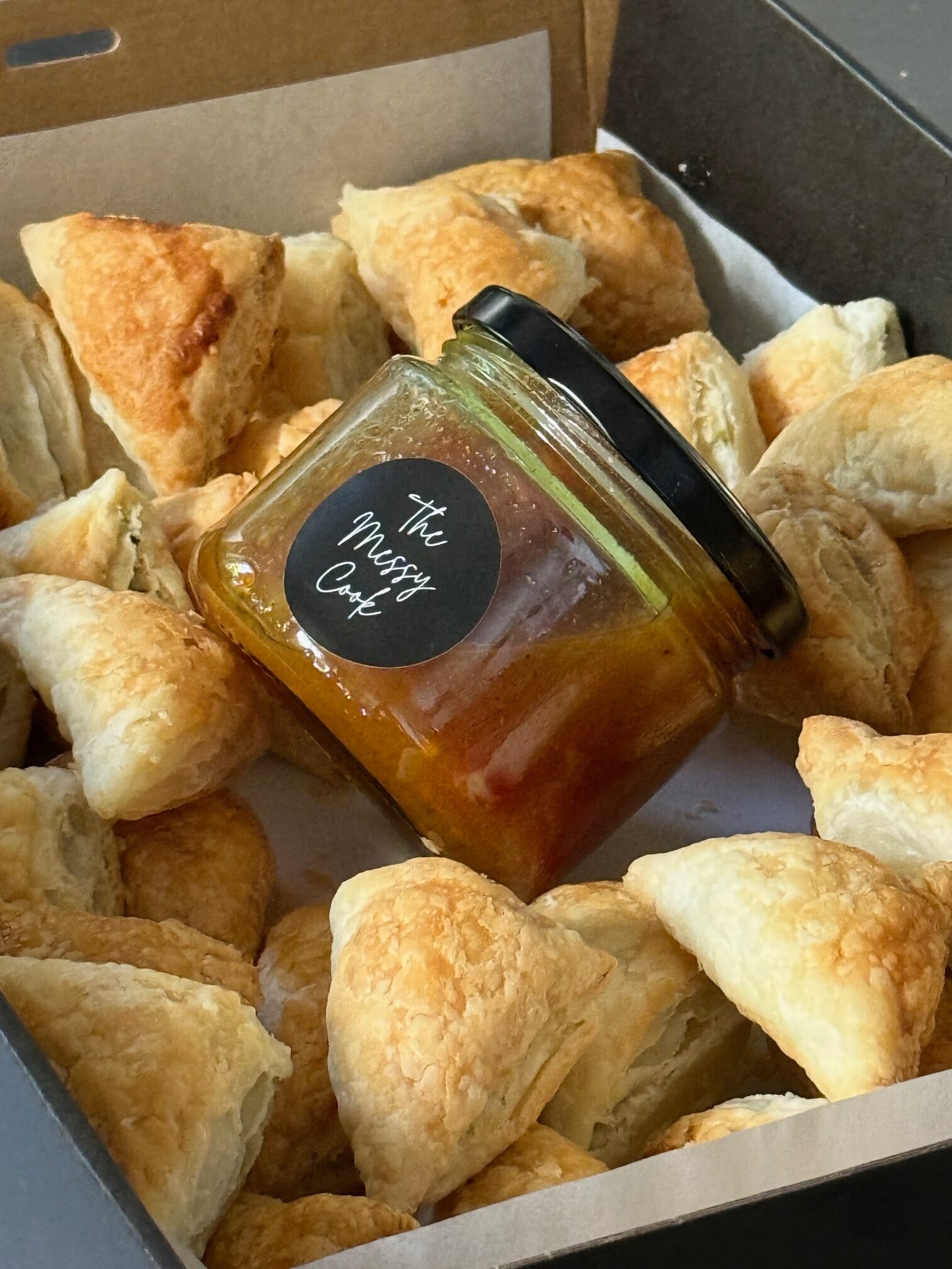 Everyone loves these tasty triangles, they can be reheated in your oven or straight out of the box cold, dipped in The Messy Cooks Homemade ” Toms” Chutney.