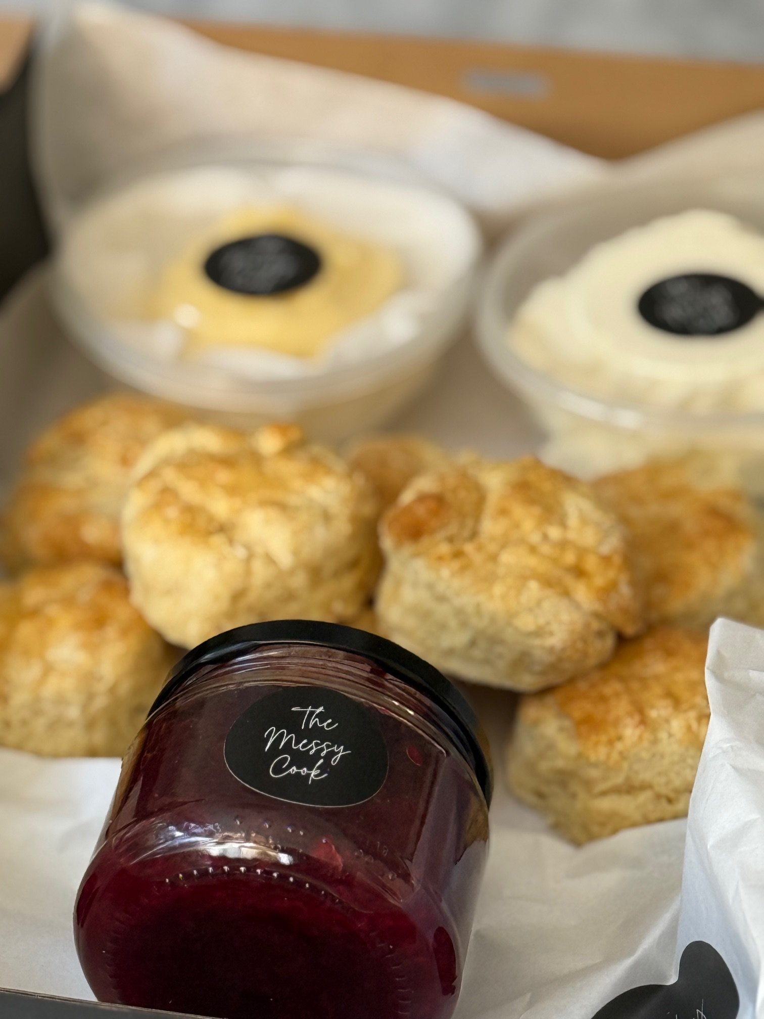 Using only the finest ingredients including homemade buttermilk, the box contains 8 scones, homemade salted butter, chantilly cream and choice of The Messy Cooks Raspberry or Strawberry & Pimms Jam