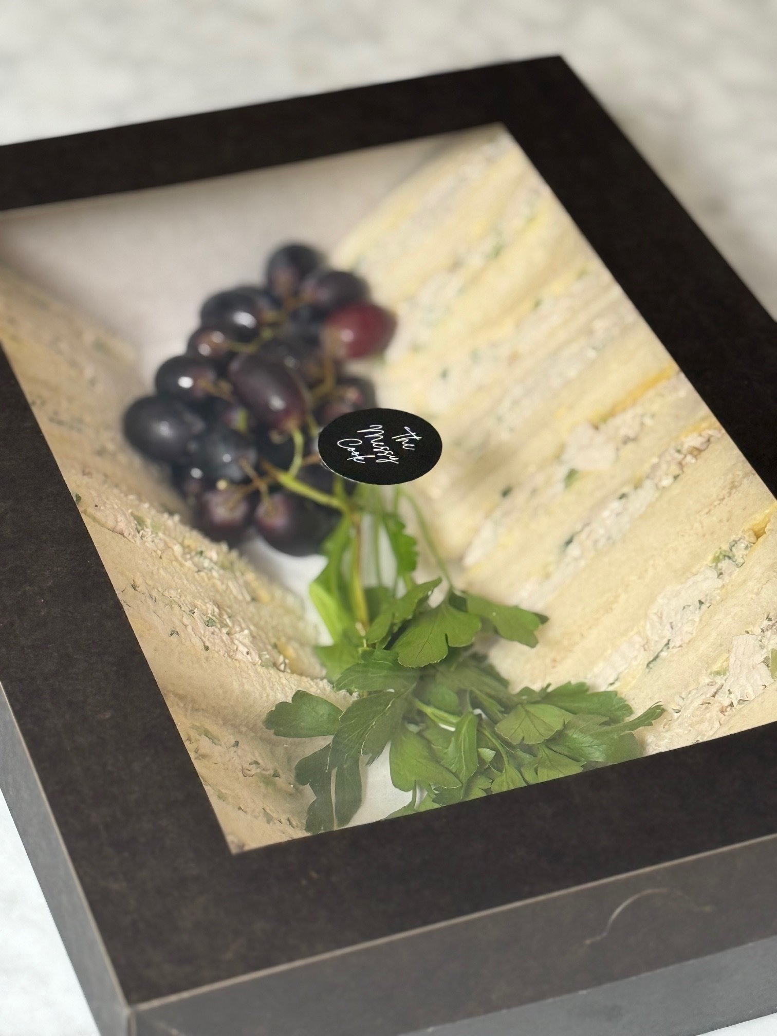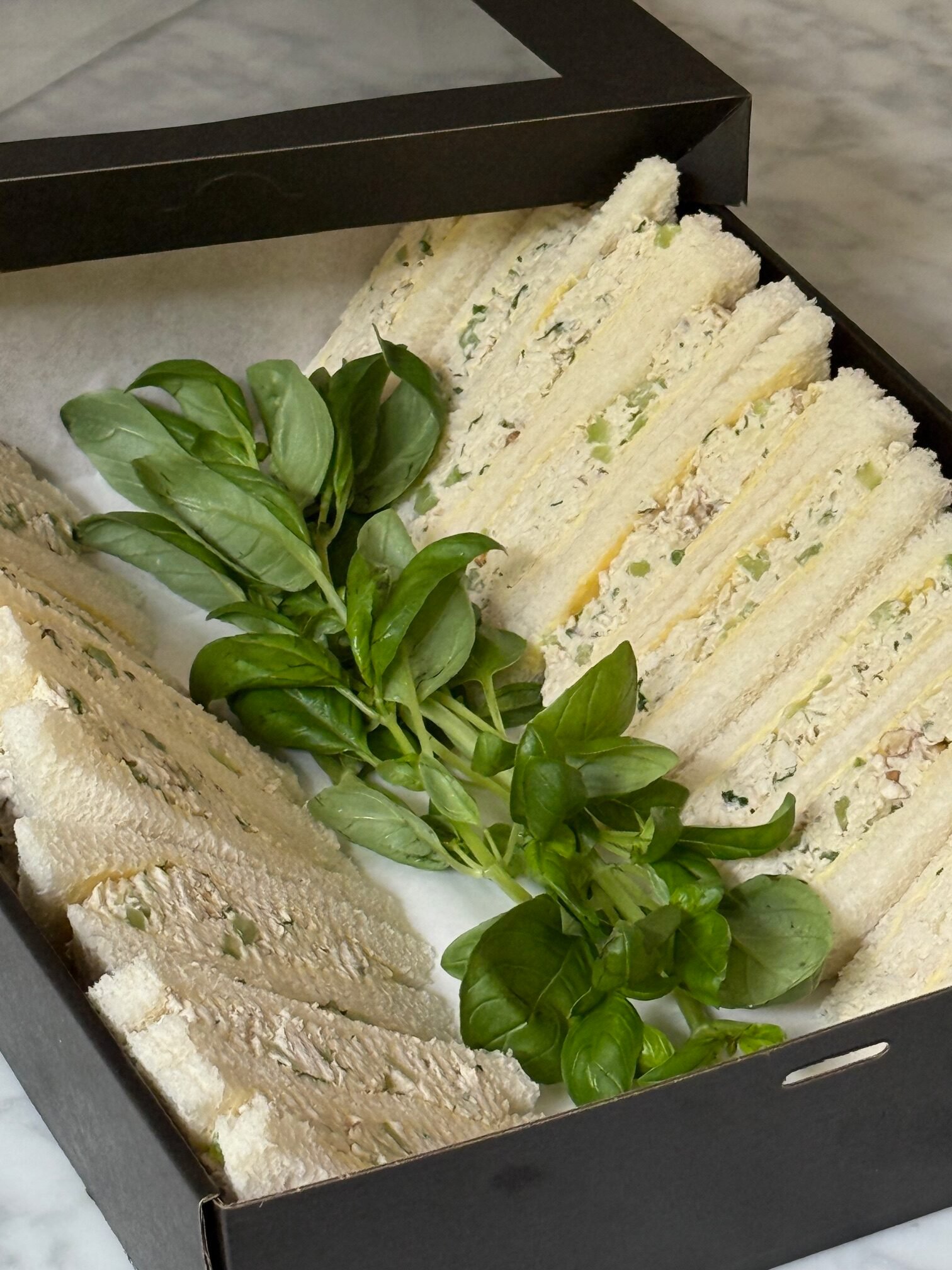 These delicate sandwiches are made with crustless soft white bread , lovely French butter , crisp fresh organic cucumber seasoned with Maldon Sea Salt topped with garlicky Aioli and a sprig of dill.
