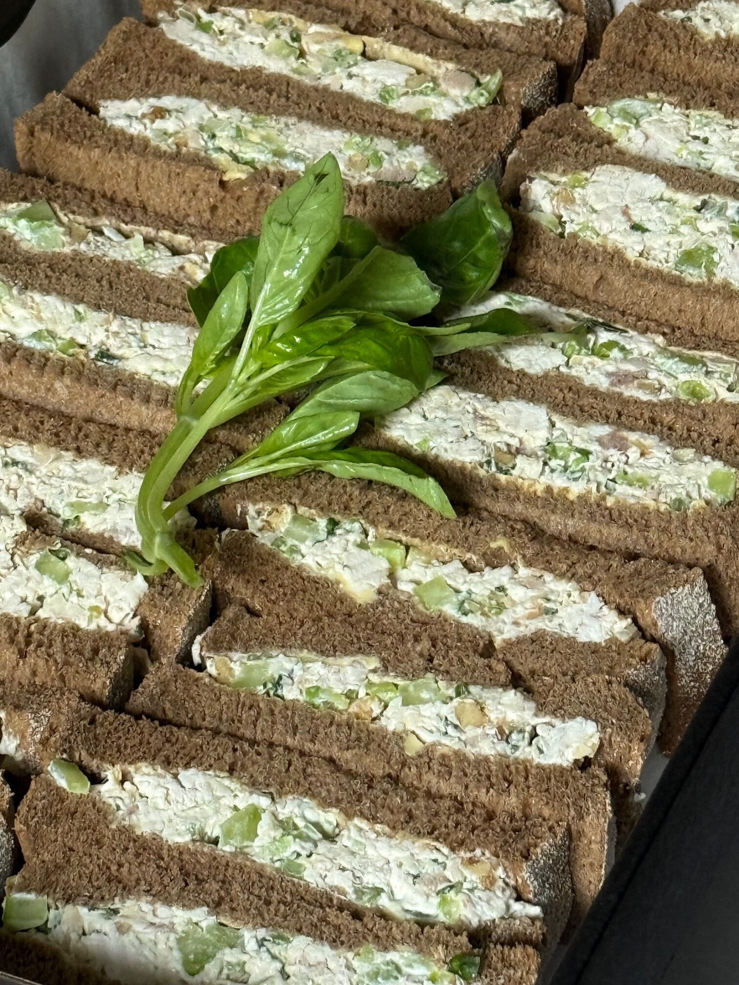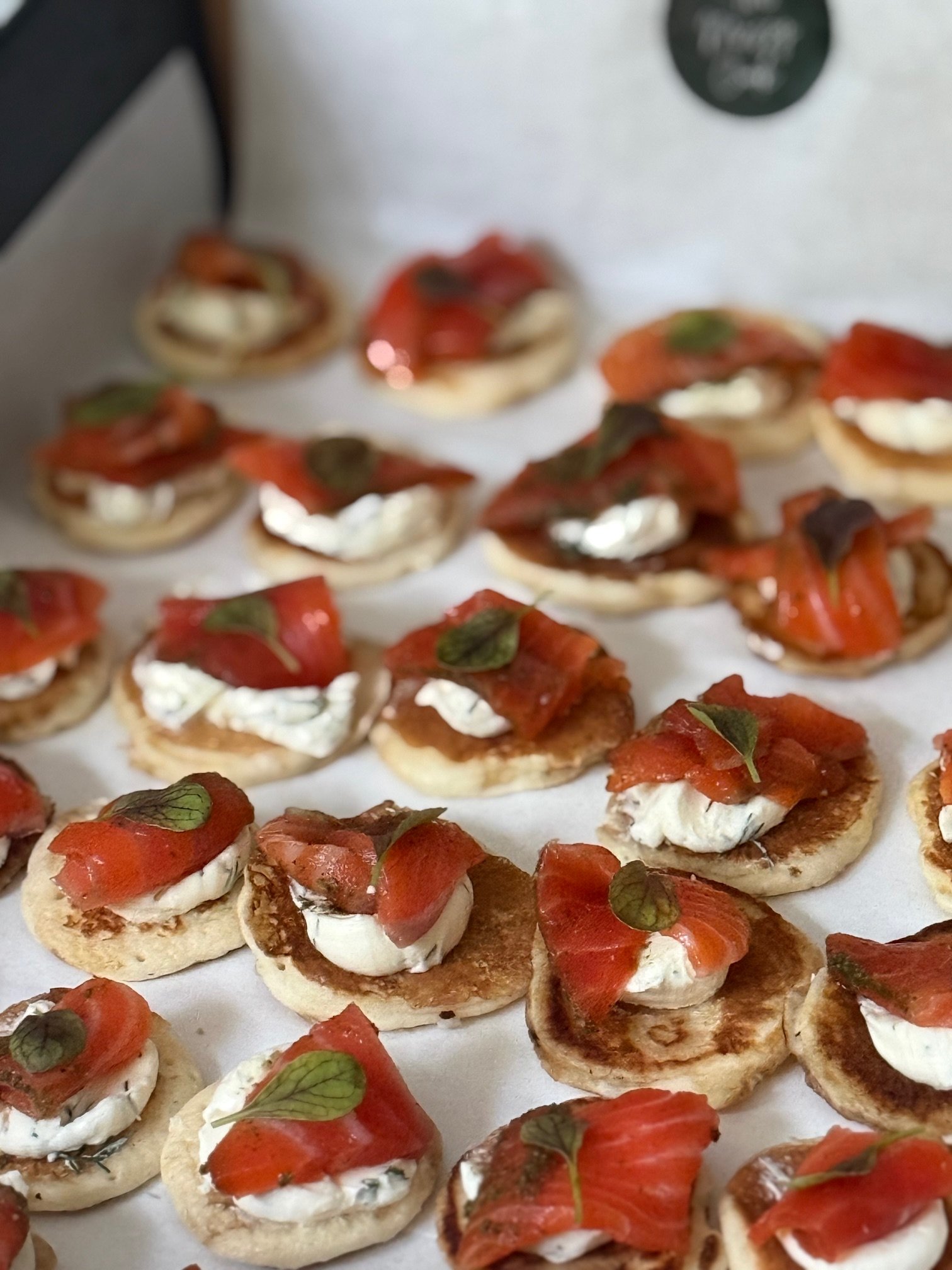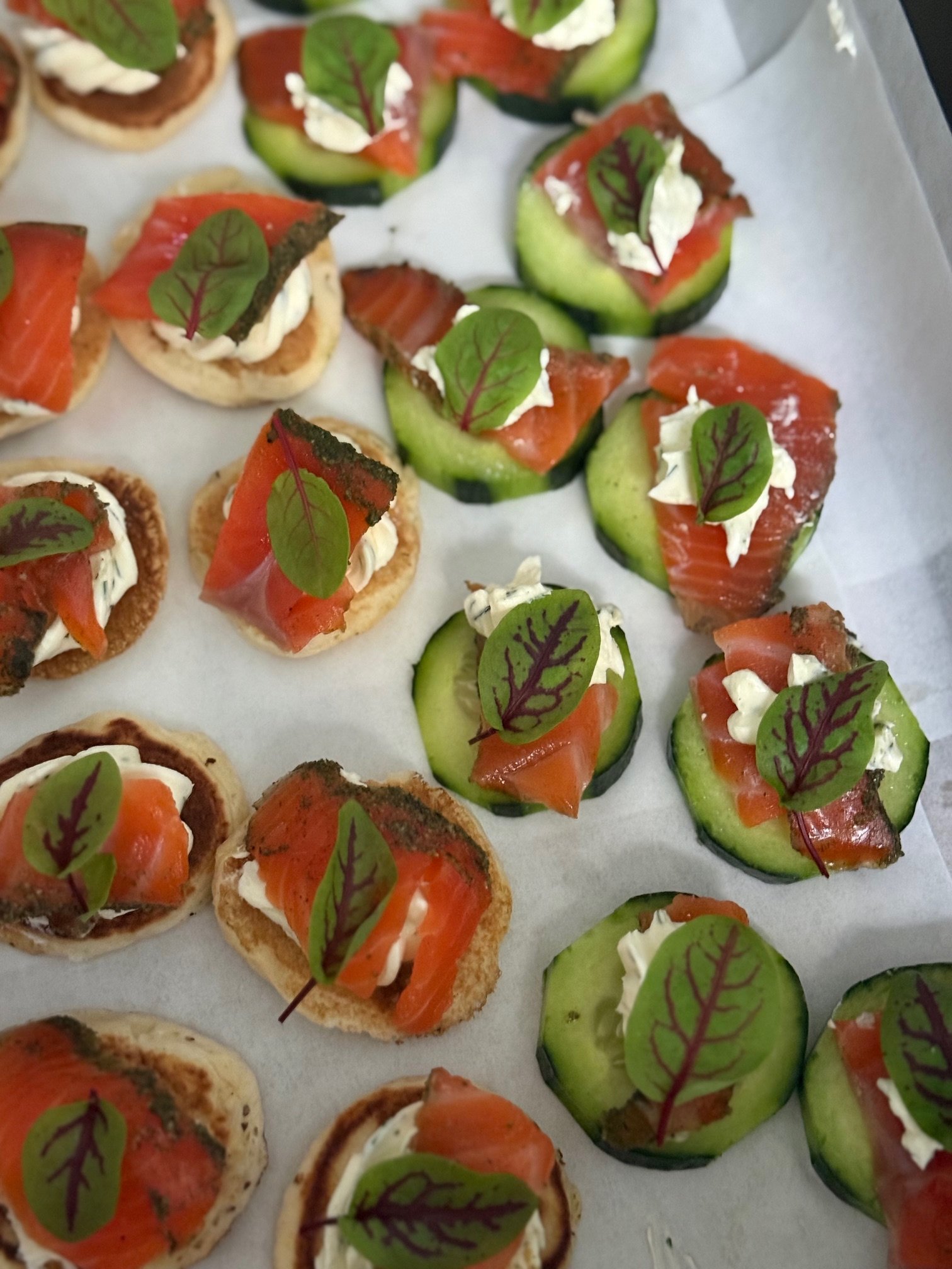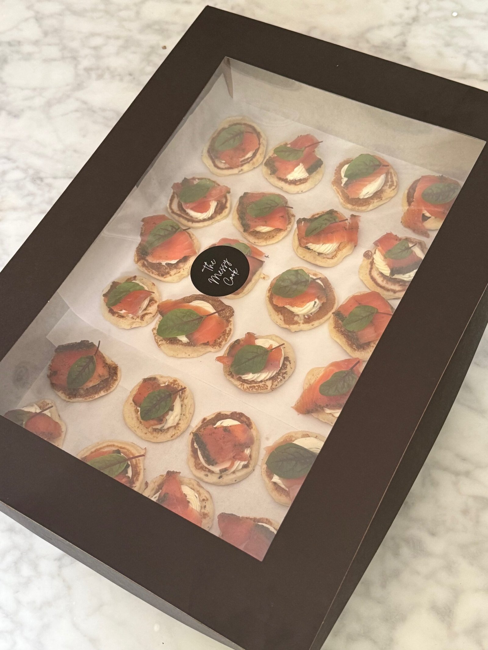 Dill cured smoked Salmon cream cheese and cucumber sandwiches Box 12 $$70