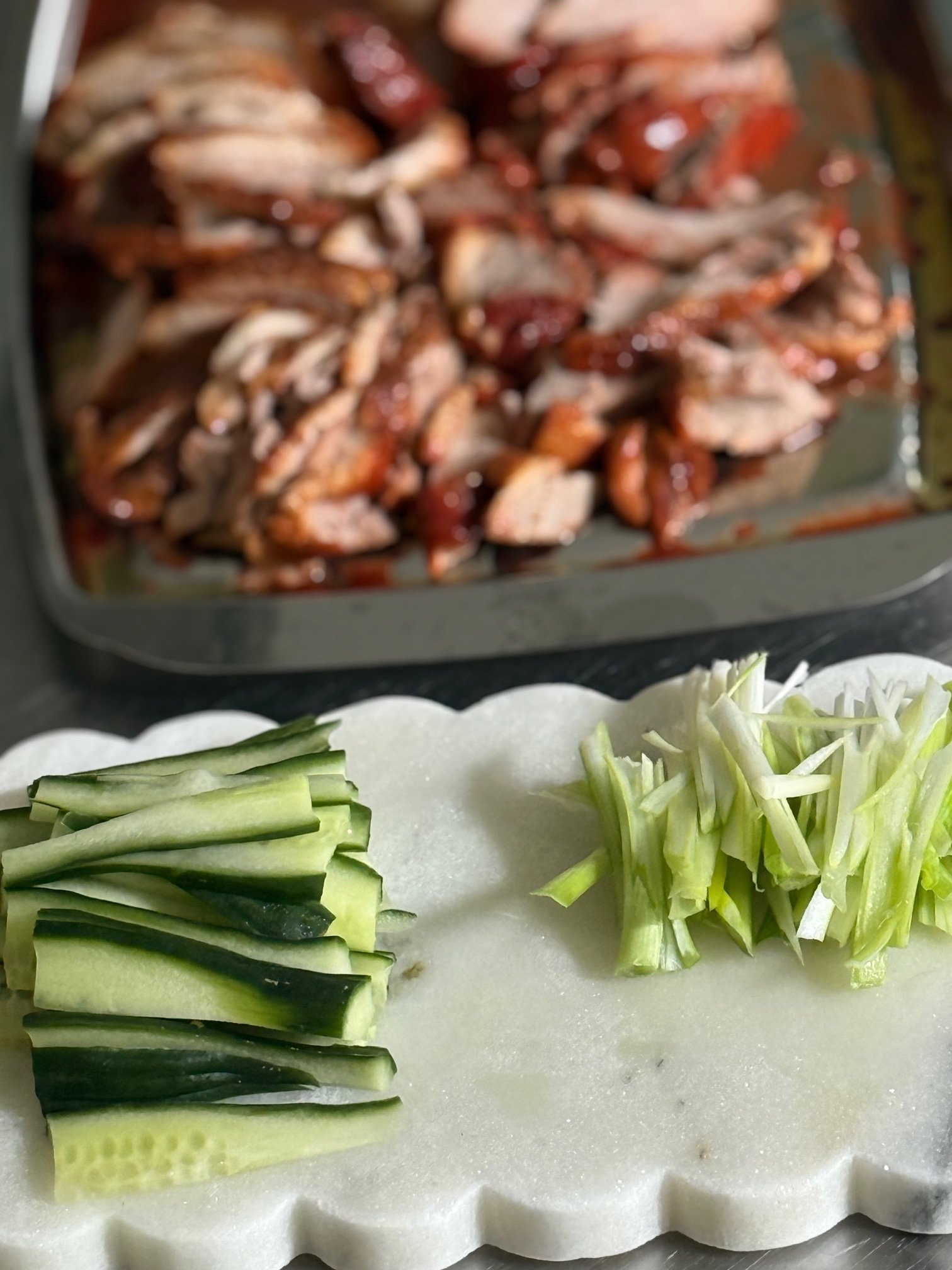 Fresh and tasty delicate duck breast wrapped in a soft pancakes filled with Hoisin sauce, shredded spring onion & refreshing cucumber sticks.