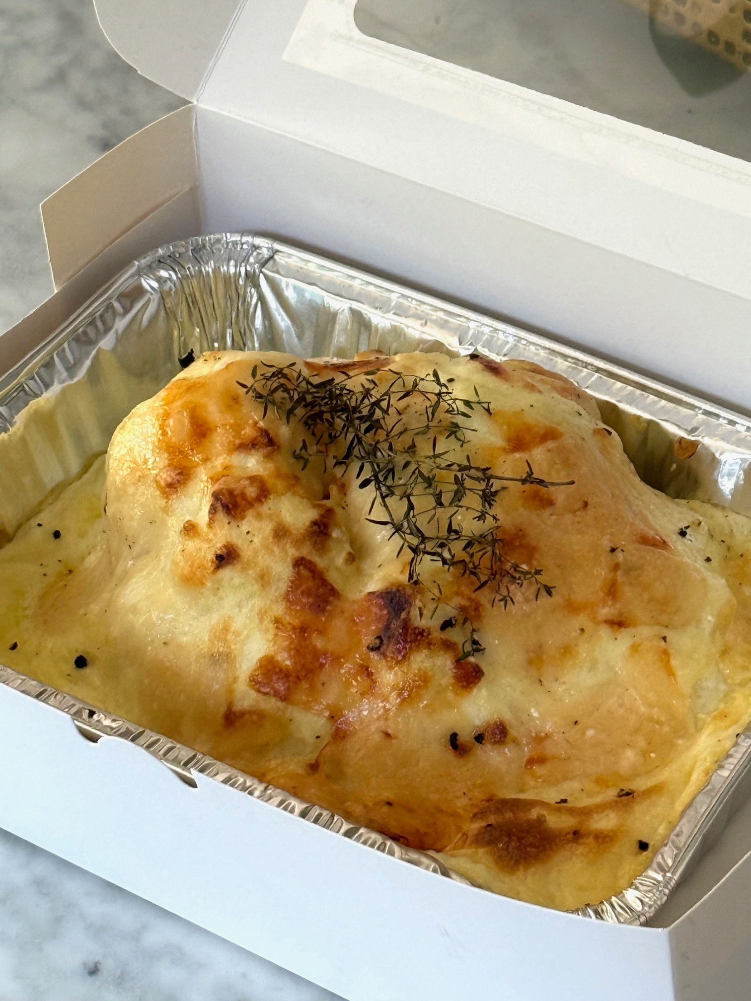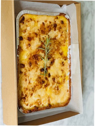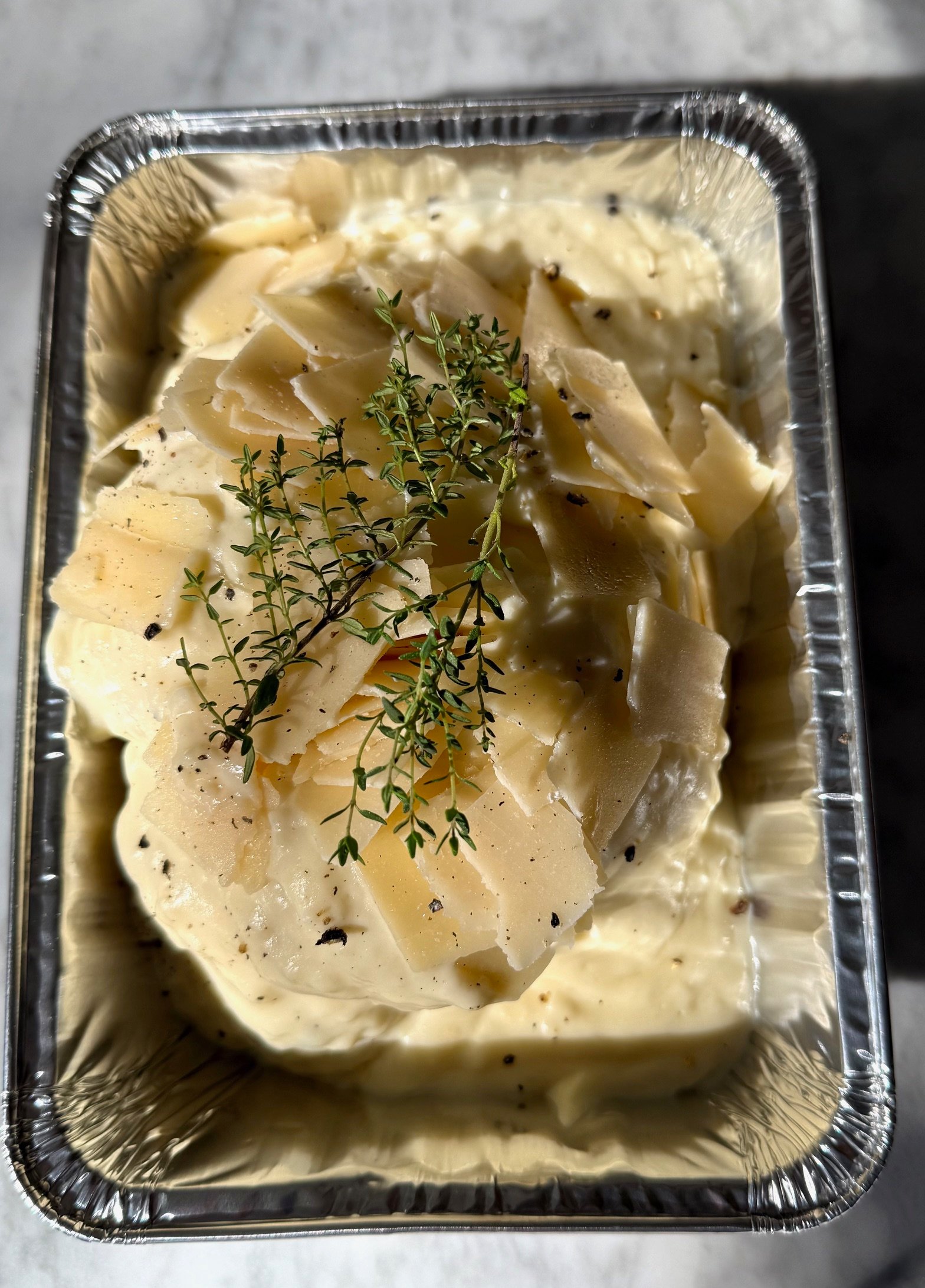 A classic French dish Delicately double cooked in cream, milk, nutmeg & sprinkled with Gruyere cheese on the top !