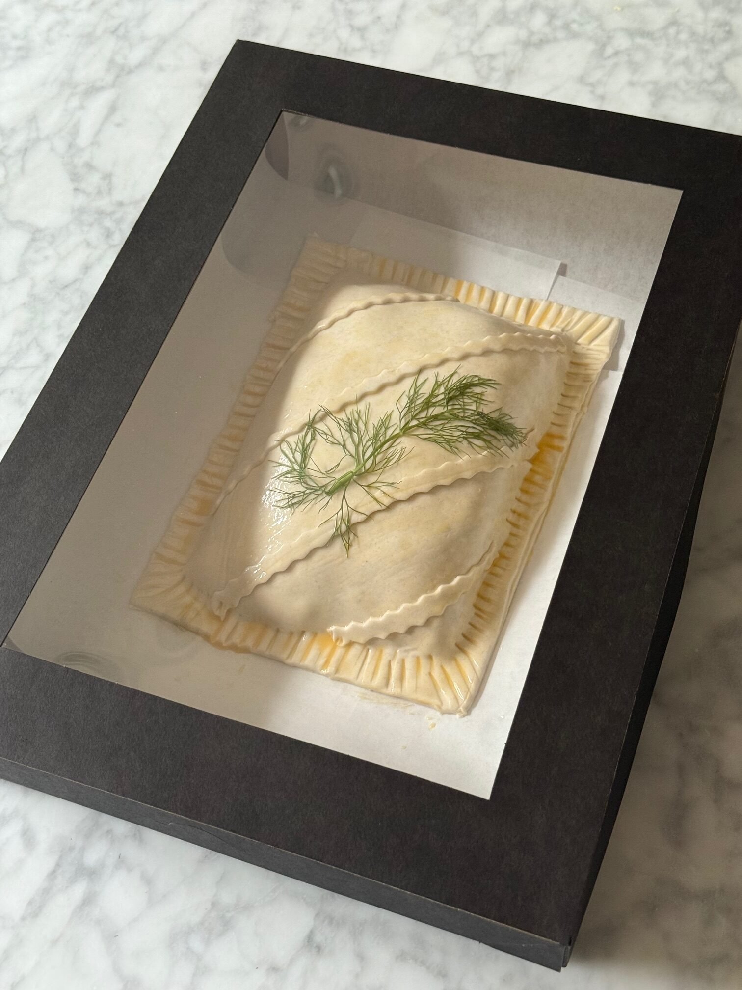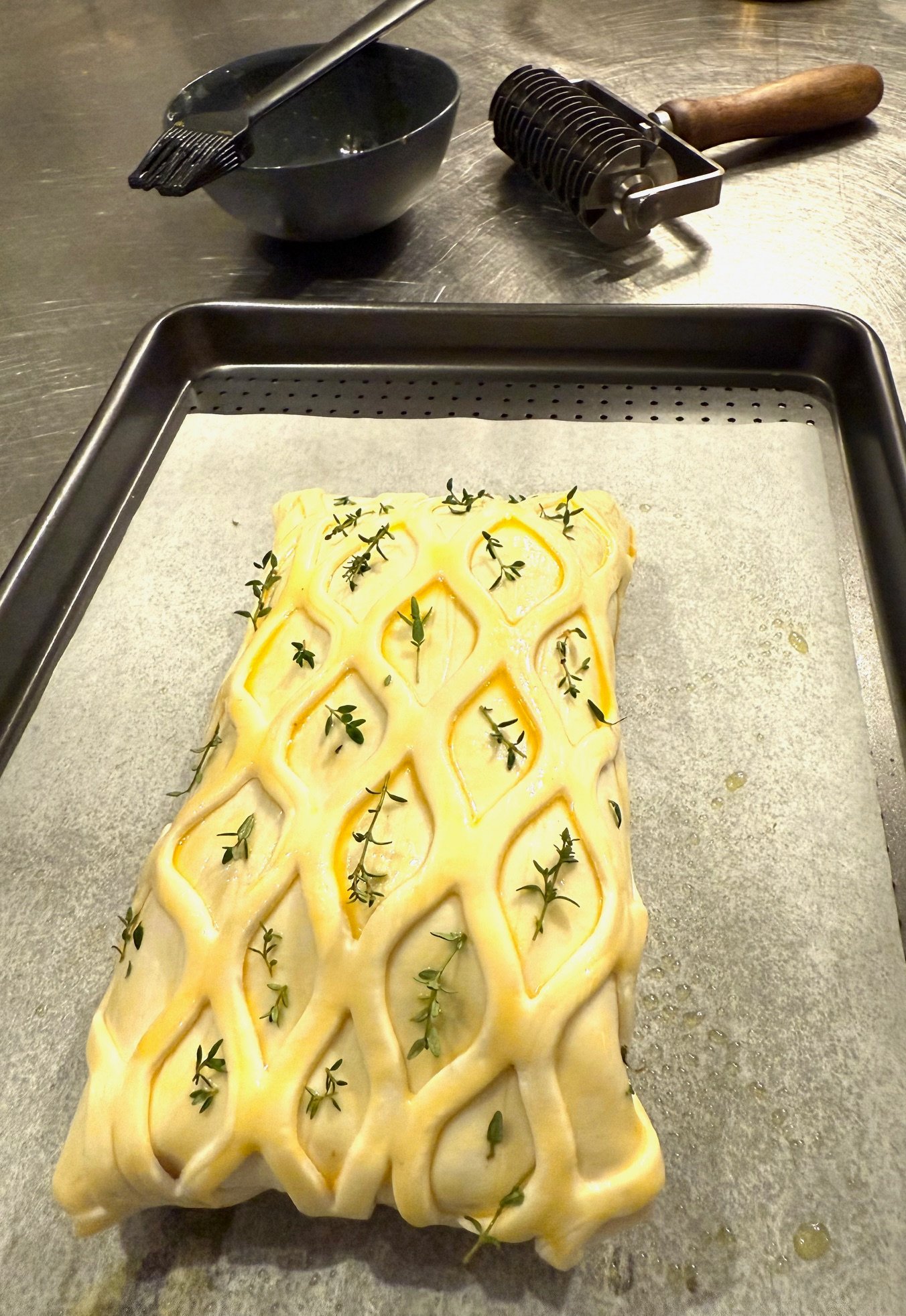 Classic French Salmon En Croute – skinless salmon topped with bechamel dill and spinach with a touch of lemon encased in butter puff pastry.