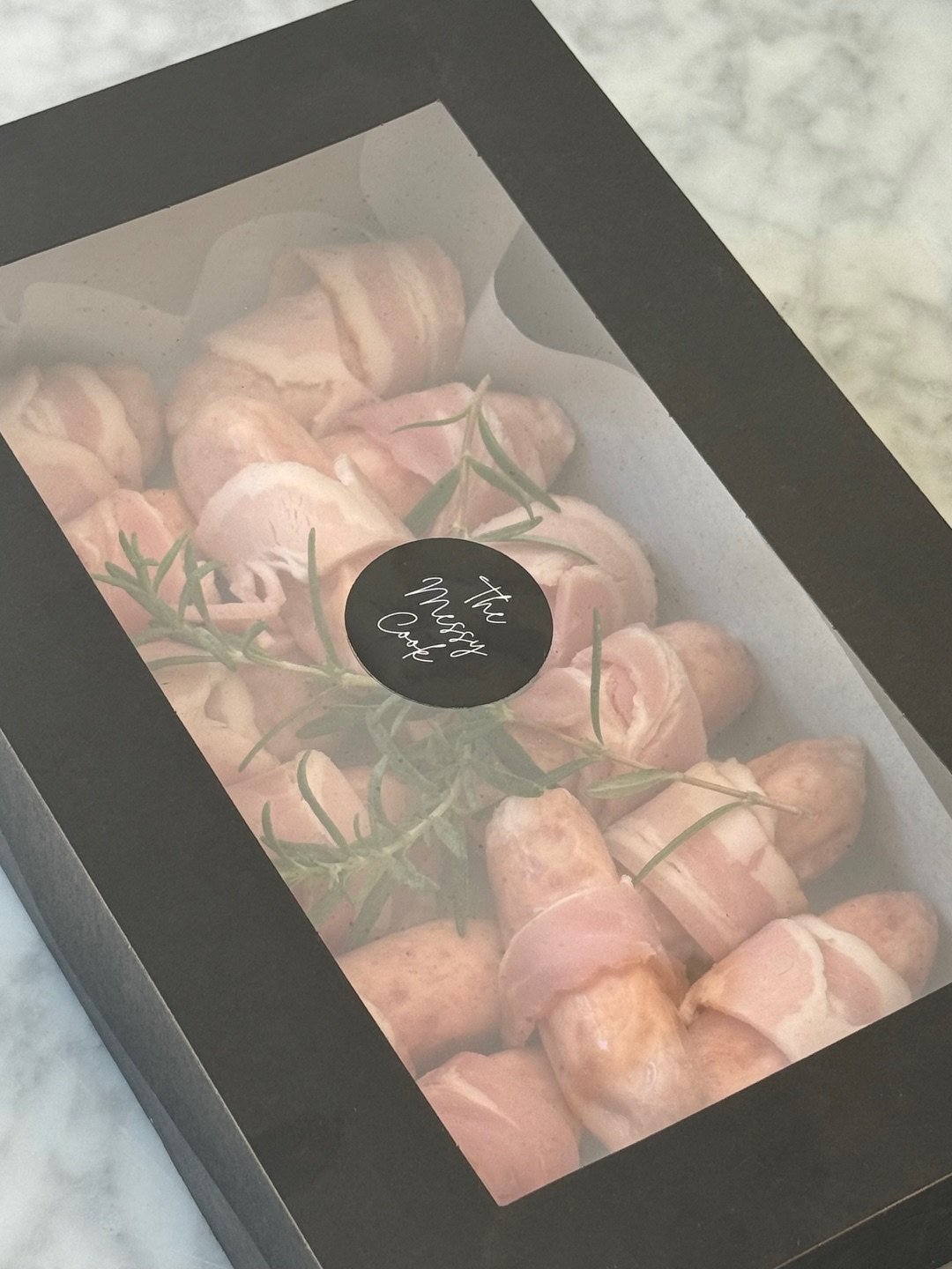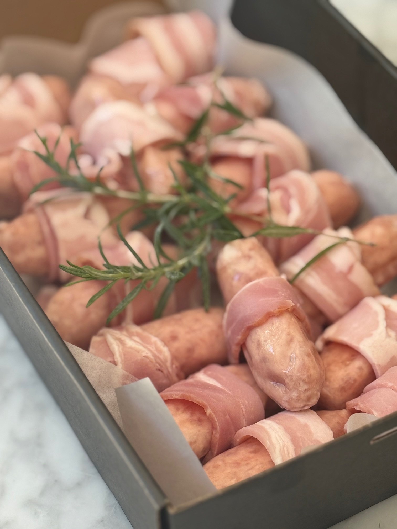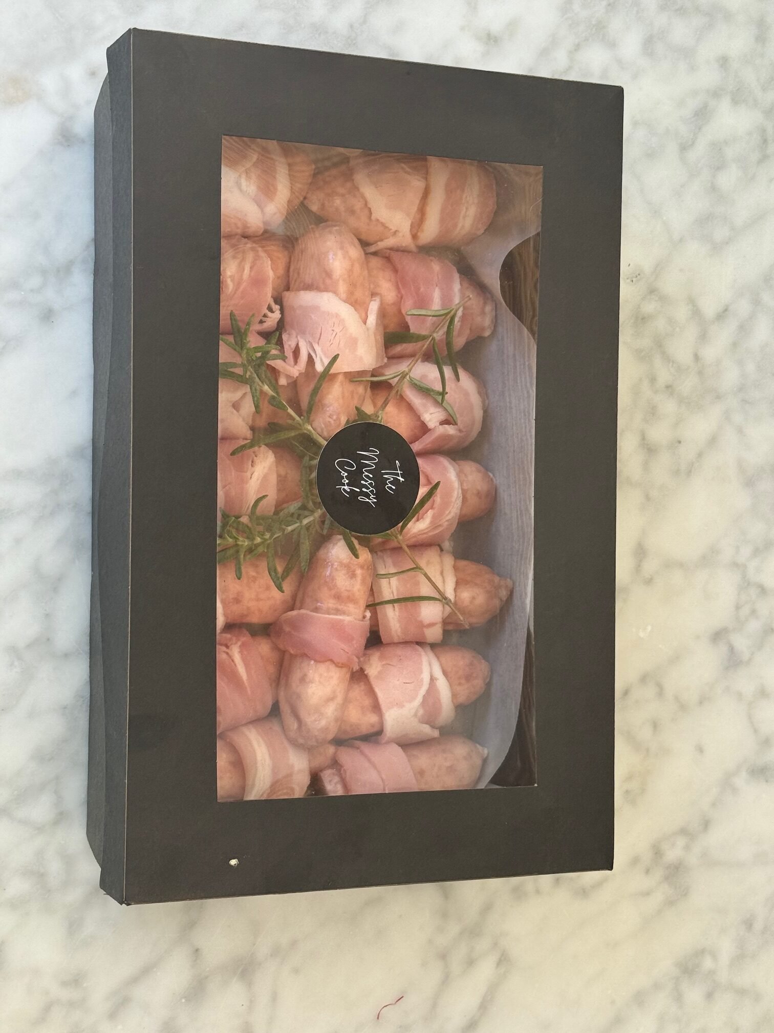The Messy Cooks box of 12 Pork mini sausages are wrapped in Maple syrup streaky bacon Perfect with your Xmas Roast