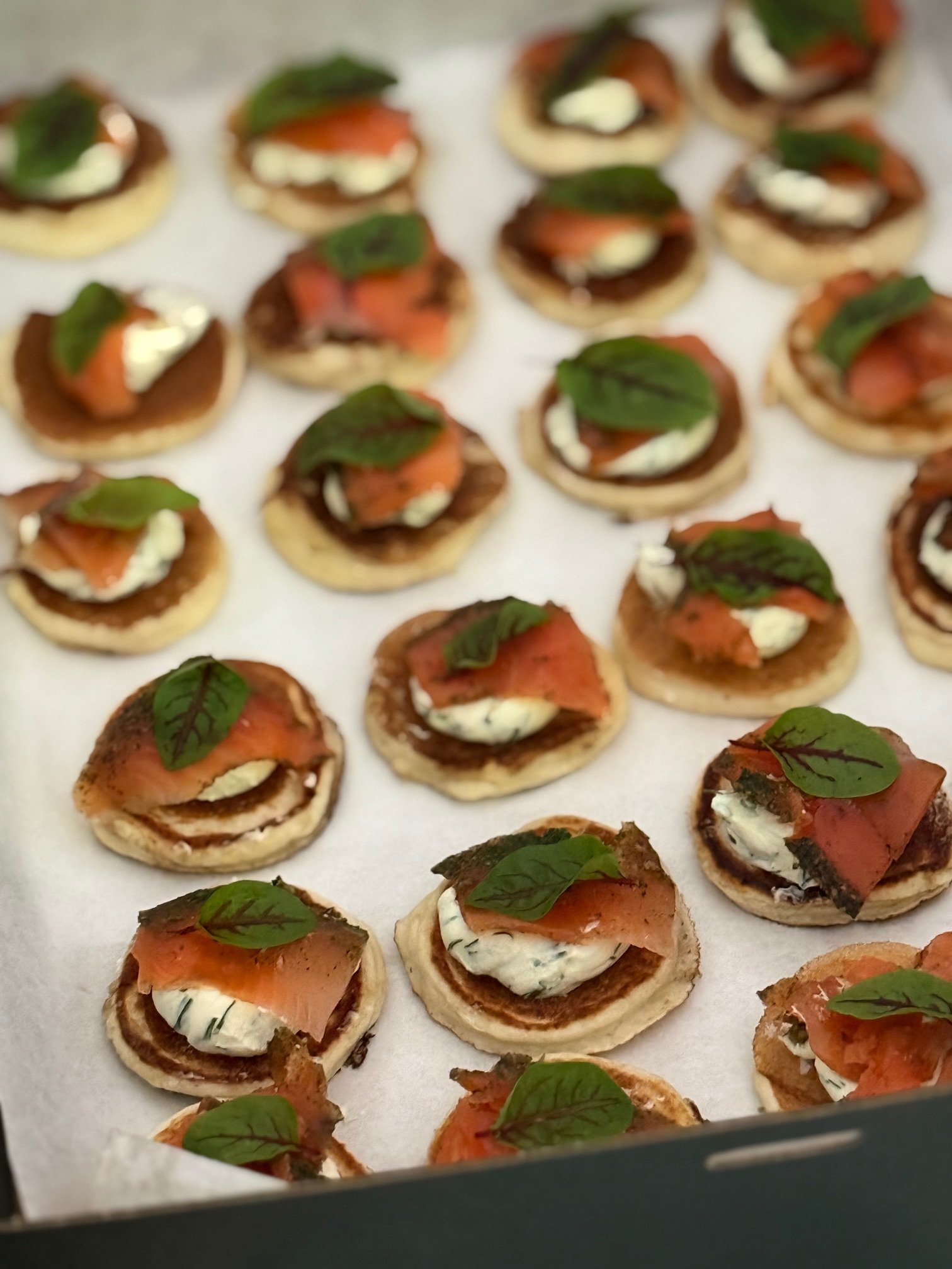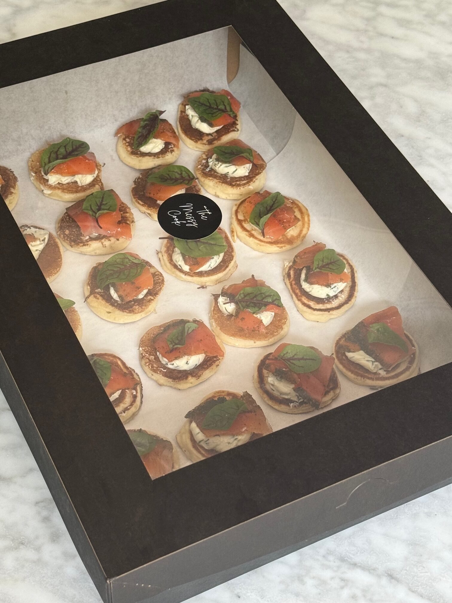 Christmas Blinis topped with Vodka Infused smoked Salmon on cream cheese , Lemon , Dill topped with micro herbs Box 24 $85