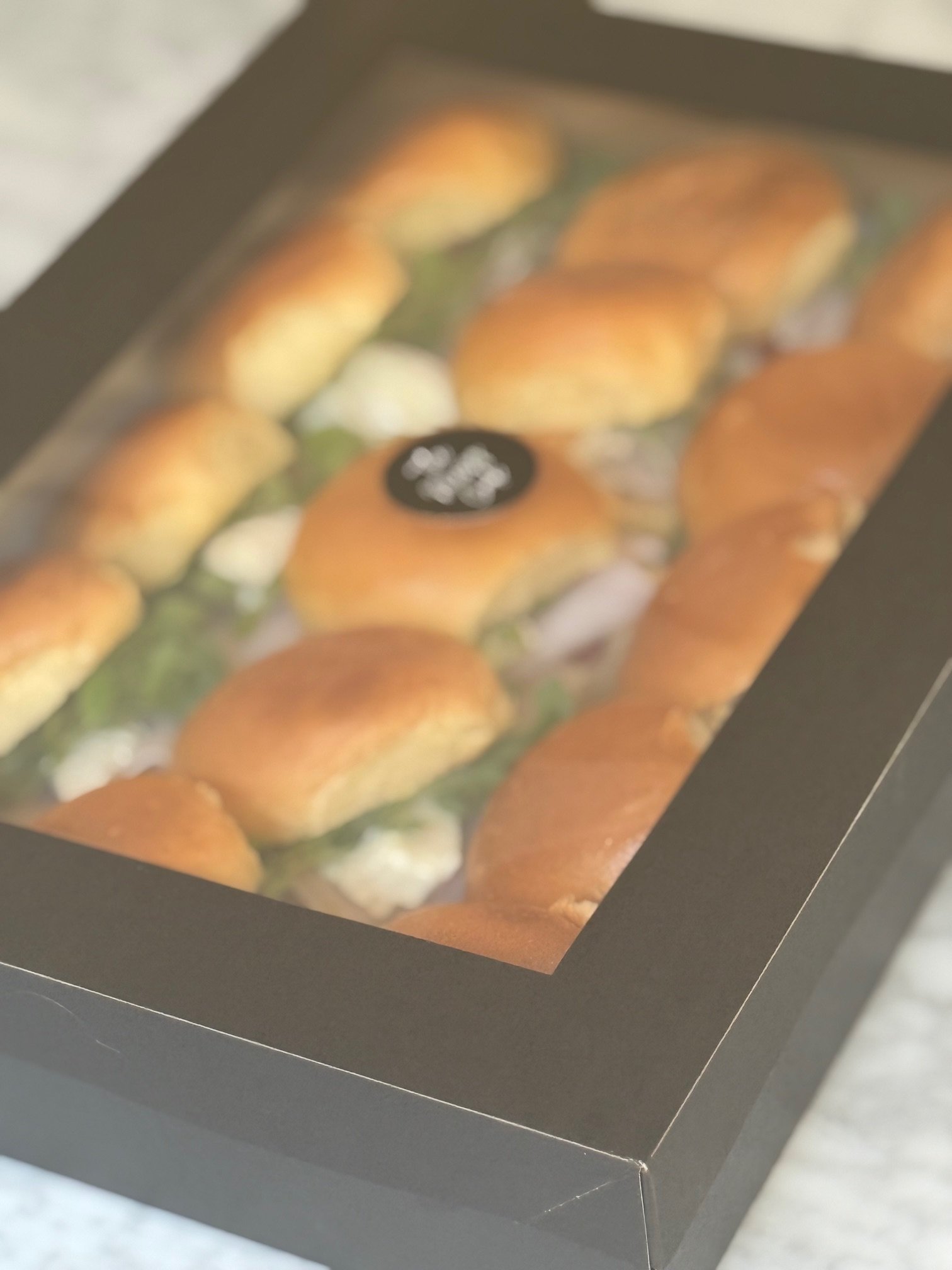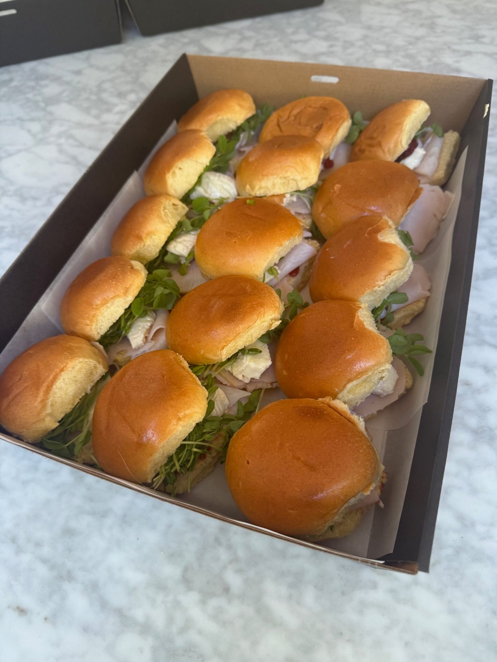 Christmas Turkey sliders on mini brioche buns with French Brie, Cranberry sauce and Bean Sprouts $85 box 15