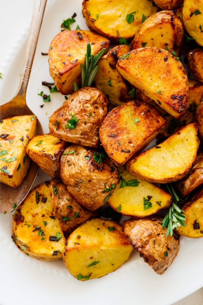 Par Boiled then roasted with fresh garden rosemary & Thyme and drizzled with olive oil, butter & of course Maldon sea salt.