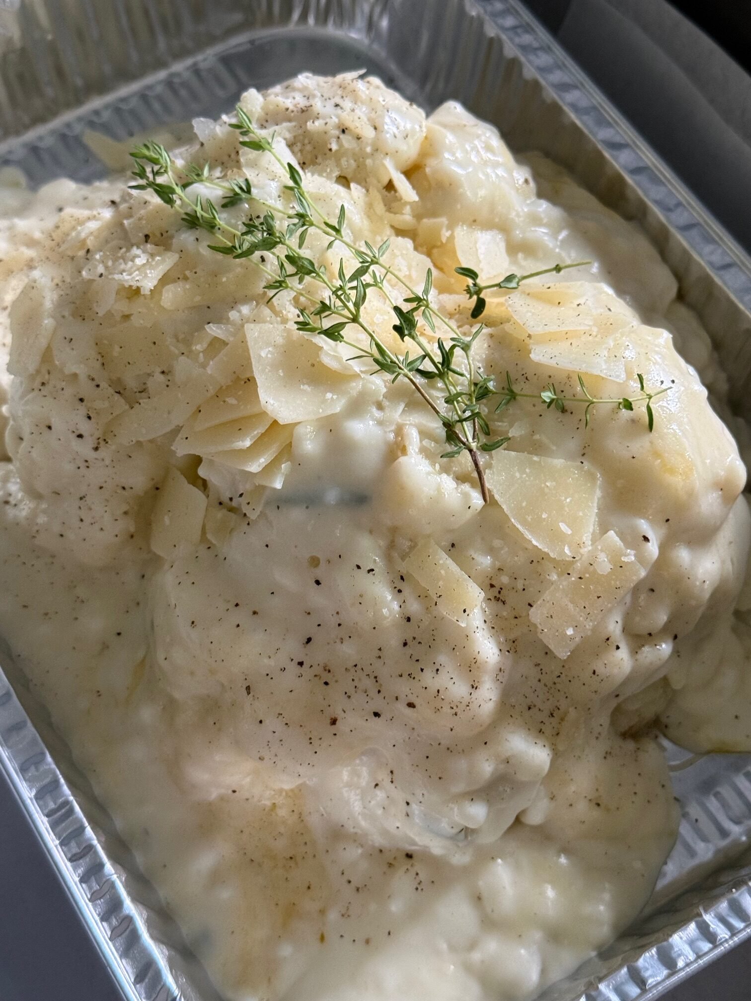 Classic Organic Cauliflower cheese in a creamy bechamel sauce topped with Grana Pandana garnished with fresh garden herbs . Reheat in your oven 190c for 20 mins until golden brown and bubbling. Comes in oven to table foil and portable box .