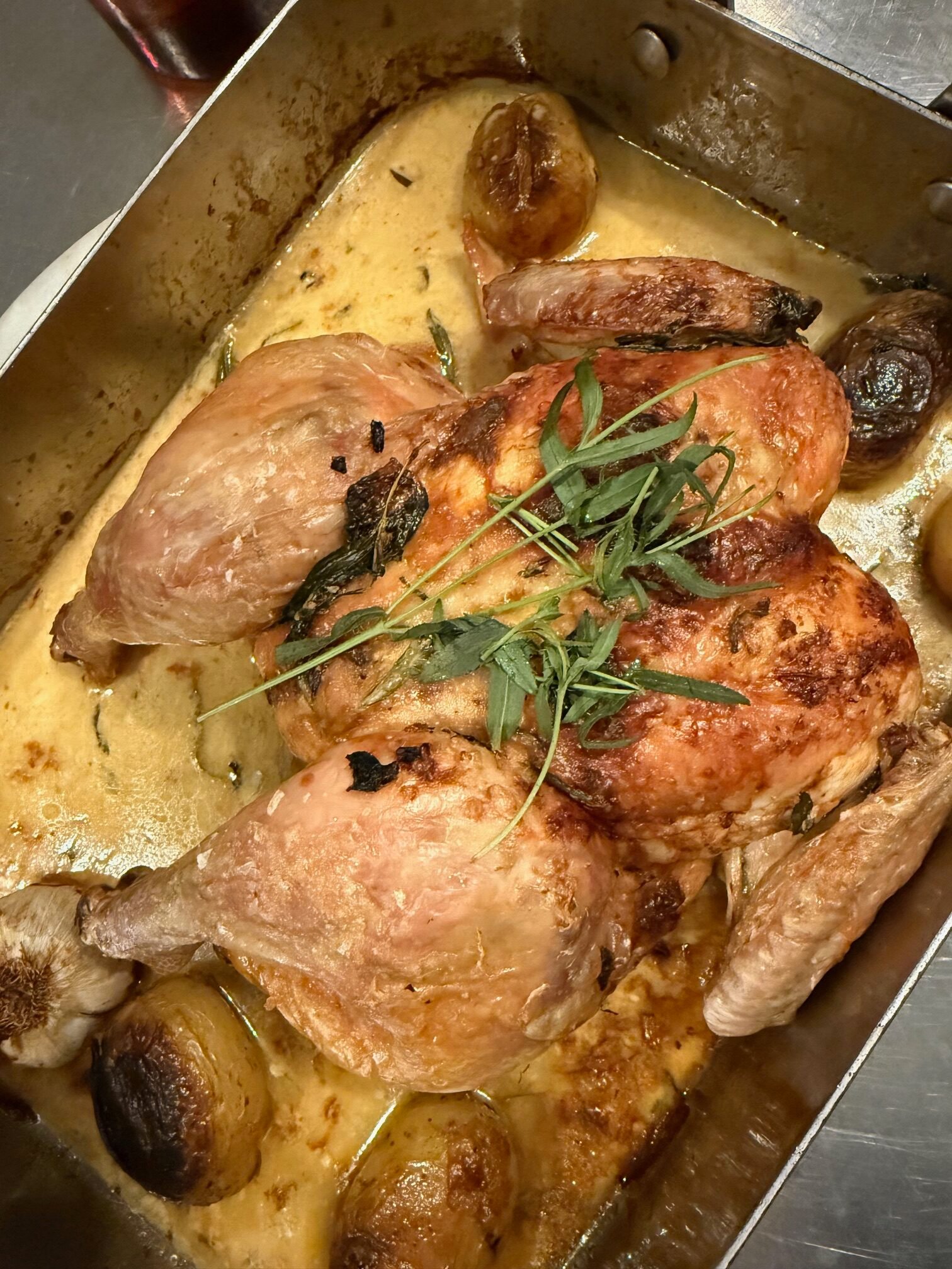 Organic Tarragon chicken in white wine sauce $100