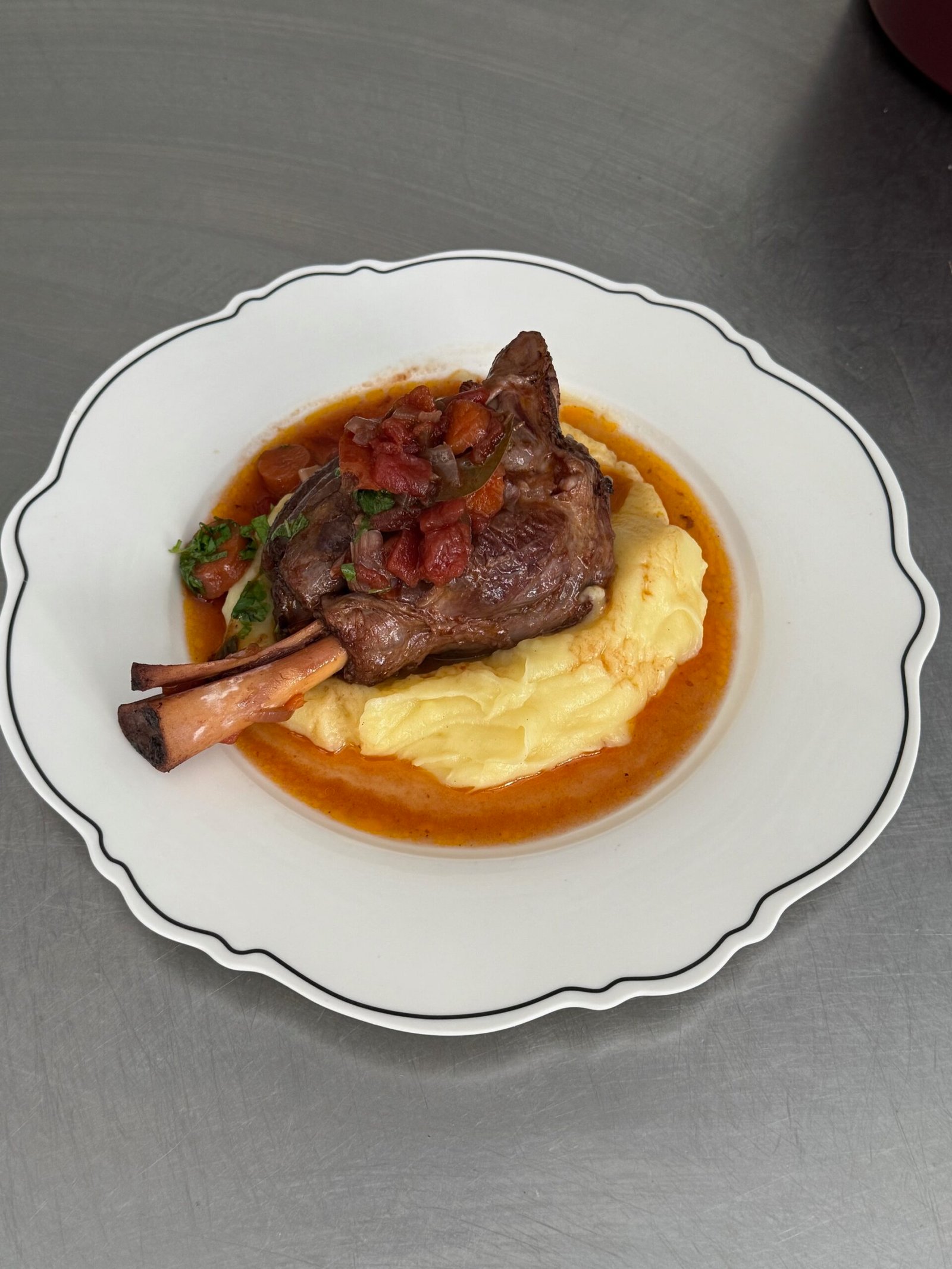 Presented in an enamel dish for oven to table presentation… topped with the Messy Cooks Piped Parish mash and a drizzle of Gruyere cheese.
