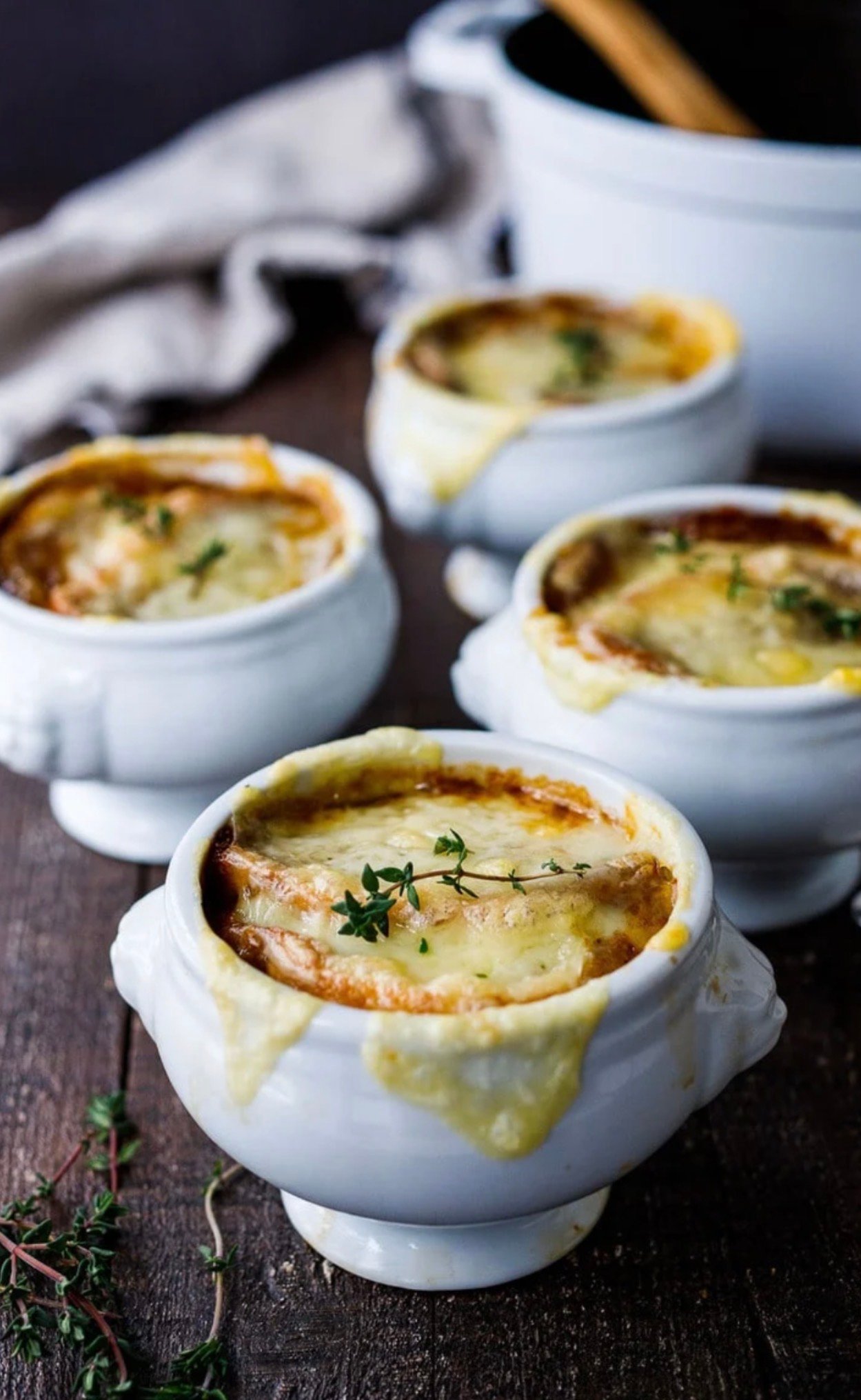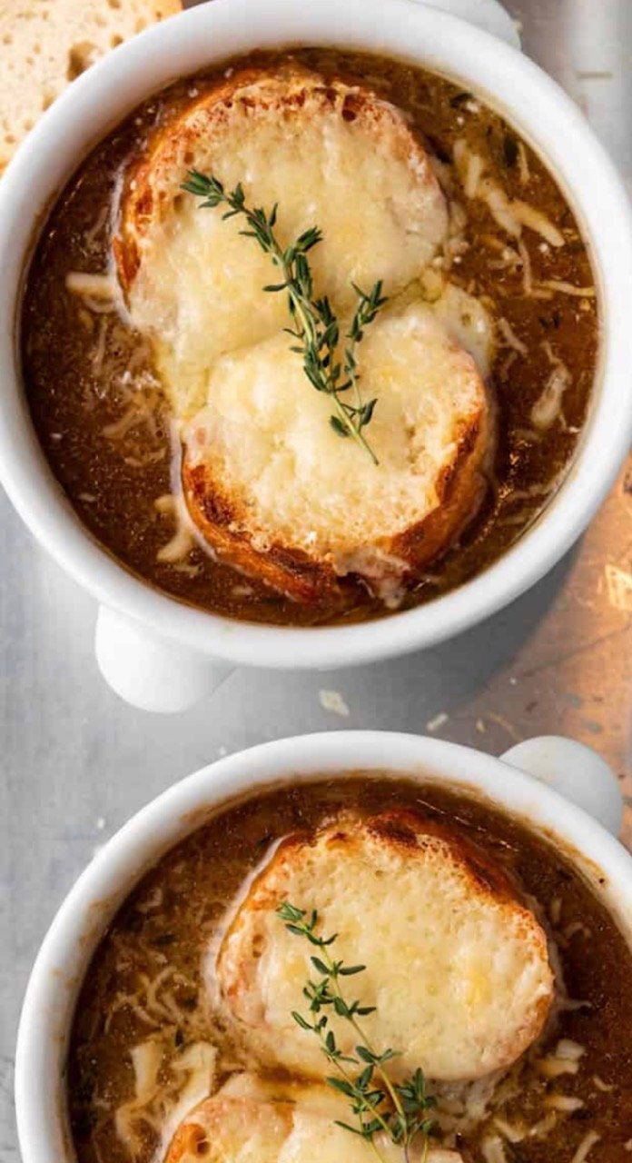 comes with 6 croutons topped with french gruyere cheese and fresh garden thyme
