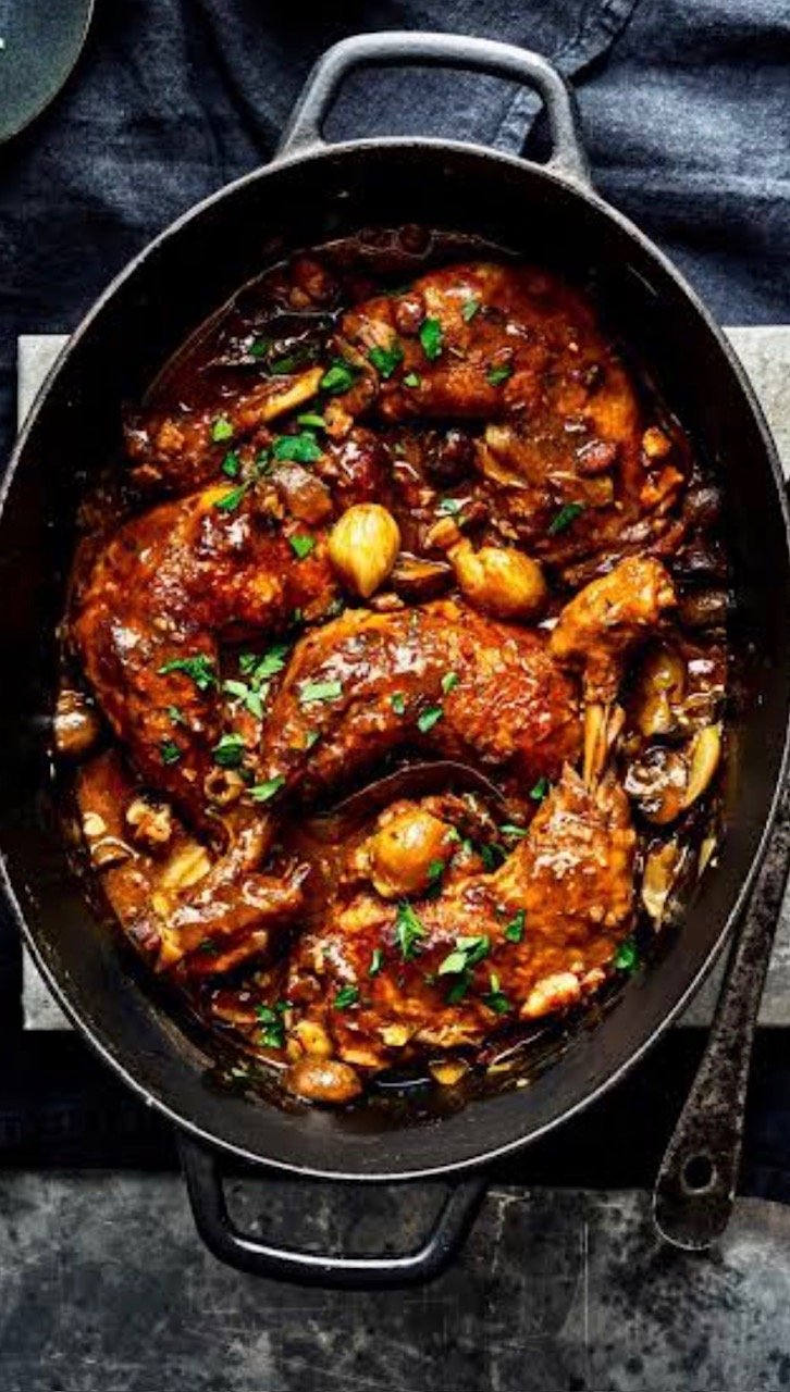 Winter comfort food… Coq au Vin is a robust casserole in a red wine sauce with mushrooms. 8 Pieces of slow cooked chicken thighs that are so tender …..
